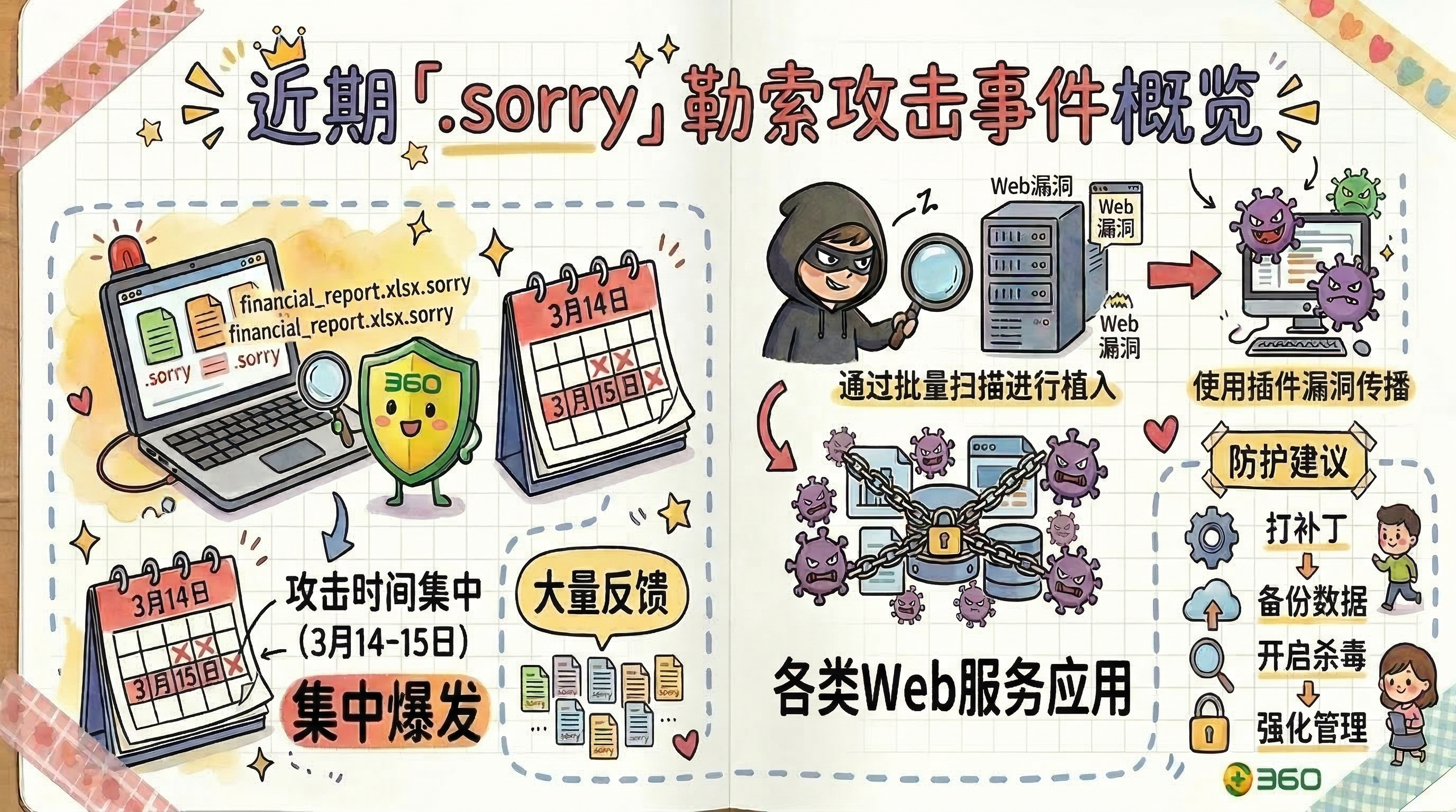 本月加密文件名被修改为.sorry后缀的勒索攻击出现大量反馈,本轮攻击的时间集中在3月14日—3月15日。
