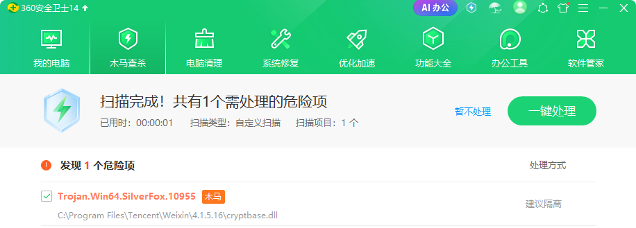 l全盘杀毒:使用有效的杀毒软件进行全盘扫描,查杀可能残留的释放器(Dropper)或其他恶意组件。目前,360安全卫士无需升级即可查杀和拦截该类木马。