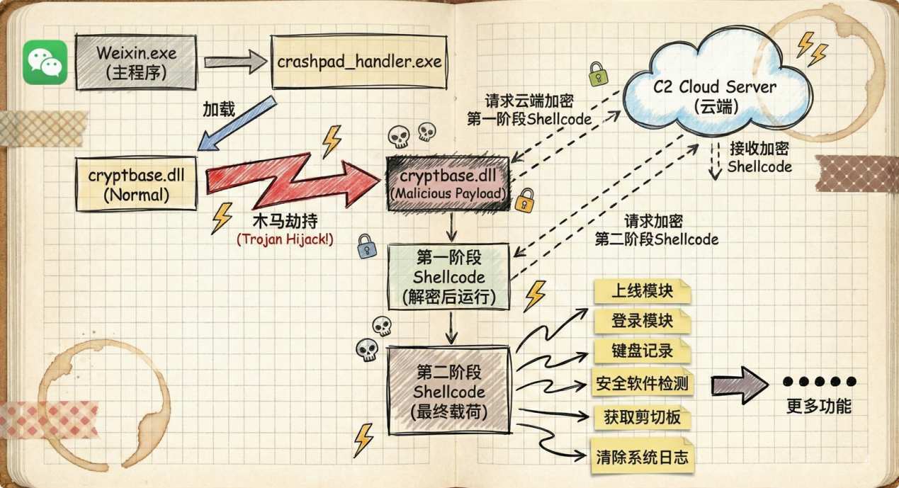 近期,360反病毒安全团队捕获到一类活跃度极高的恶意样本。攻击者将目标锁定在国民级应用——“微信”身上,其利用经典的“DLL劫持”技术,实施所谓的“白加黑”攻击。与以往常见的针对version.dll或userenv.dll两个文件的劫持不同,此次攻击者选择劫持的是更为隐蔽的系统库文件——cryptbase.dll,以及 d3dcompiler_74.dll。攻击者通过钓鱼邮件、捆绑软件等方式,将这些精心构造的恶意DLL文件释放到用户的微信安装目录下。