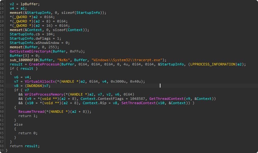 接下来,木马会将合法的tracerpt.exe程序作为宿主,以进程注入的方式在其内存空间中开辟一段代码执行空间,并写入恶意Shellcode代码,完成写入操作后,再唤醒宿主进程的主线程,这样宿主进程便会直接跳转去执行注入内存当中的Shellcode恶意代码。